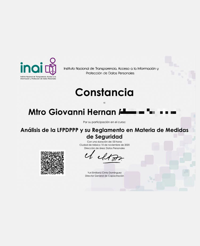 Instituto Nacional de Transparencia, Acceso a la Información y Protección de Datos Personales otorga la presente constancia por la participación en el curso: