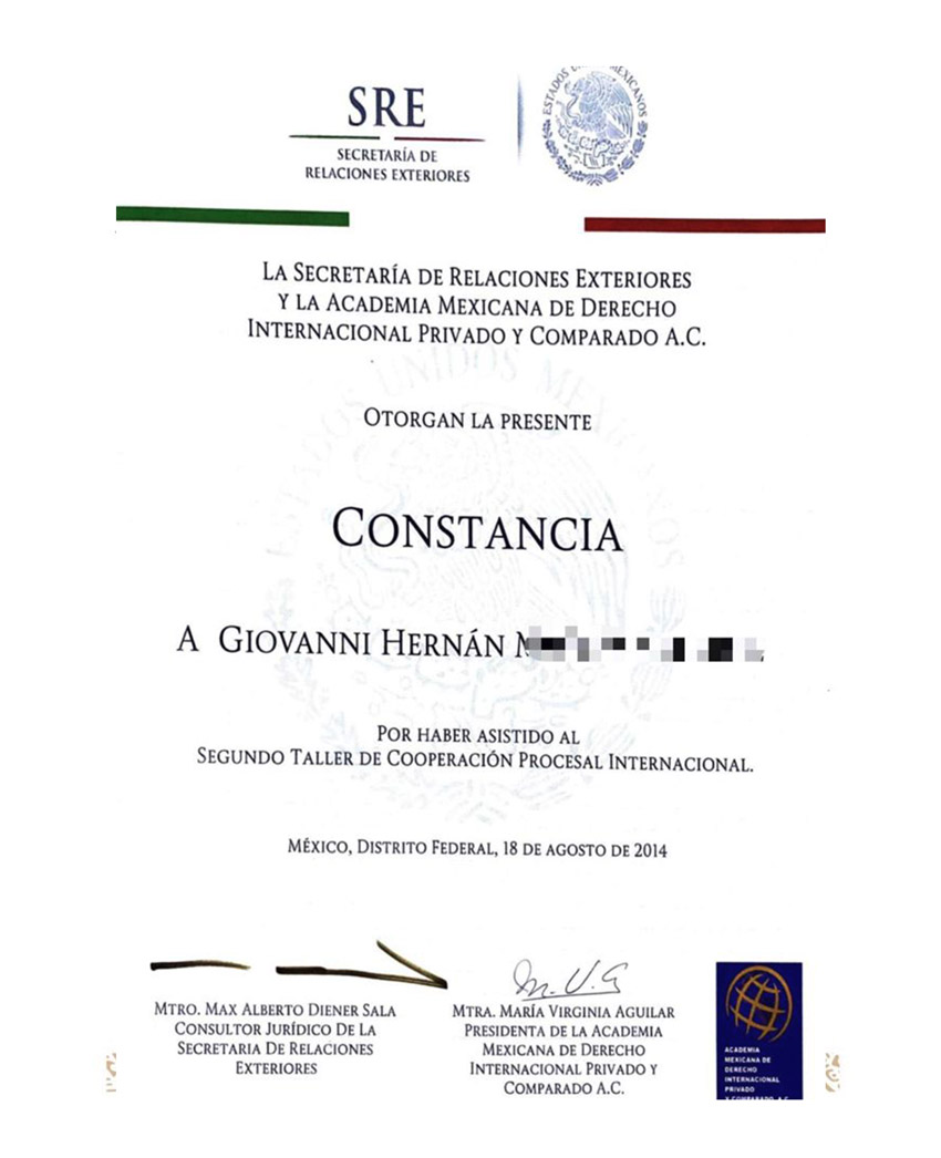 La Secretaría de Relaciones Exteriores y la Academia Mexicana de Derecho Internacional Privado y Comparado A.C. otorga la presenta constancia por haber asistido al Segundo Taller de Cooperación Procesal Internacional
